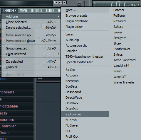 Buka fl studio, lalu buka atau load ez drummer melalui channel. lalu cari ez drummer.